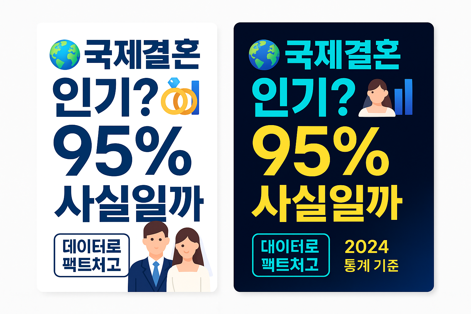- **“한국 남성의 95%가 국제결혼으로 눈을 돌린다”**는 주장은 근거 없음. 2024년 공식 통계 기준, **전체 혼인 중 국제혼 비중은 9.3%**에 불과합니다. 이 가운데 ‘한국 남편+외국인 아내’가 7.0%, **‘한국 아내+외국인 남편’이 2.3%**입니다. 통계청