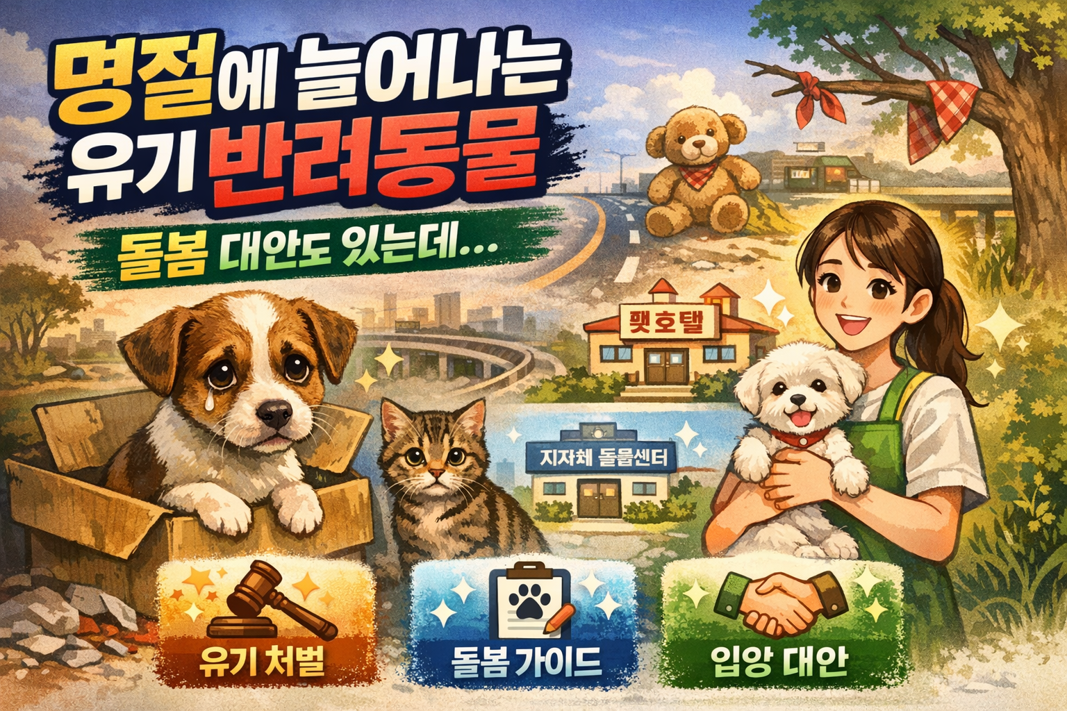 설·추석 같은 명절 연휴에 반려동물 유기·유실이 왜 늘어나는지, 법적 처벌, 지자체 무료 돌봄·임시 애견호텔, 펫시터·펫호텔 이용 팁, **유기 대신 가능한 대안(입양·양도·돌봄 연결)**까지 한 번에 정리했습니다. 명절 반려동물 돌봄을 준비하는 보호자라면 꼭 확인하세요.