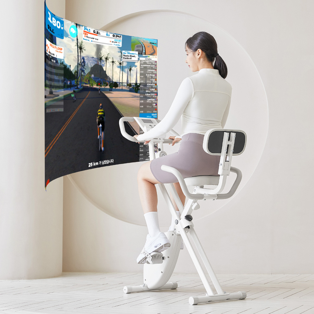 엑사이더 리얼 실내자전거는 등받이형 디자인으로 장시간 운동 시 허리 부담을 줄여주며, 즈위프트(Zwift) 연동 기능이 있는 스마트 센서 바이크입니다. 접이식 구조로 공간 활용성이 높아 가정 내에서 유용하게 사용할 수 있습니다.