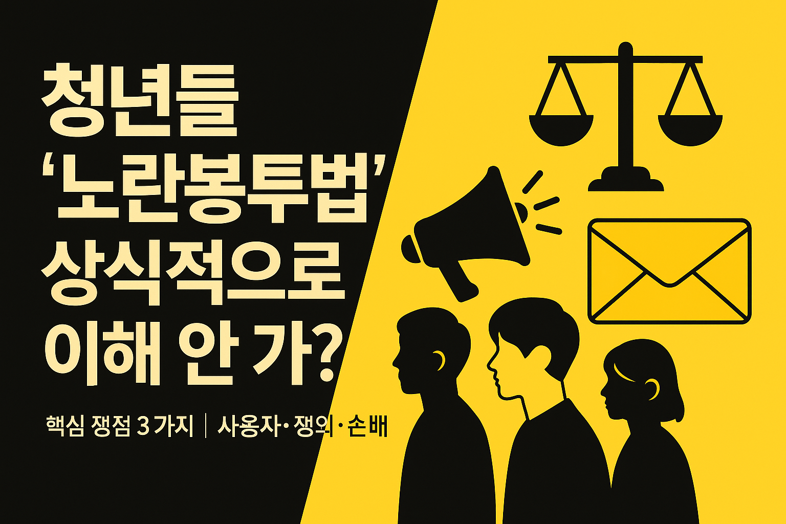 - 노란봉투법은 한국 노사관계의 좌표를 재설정할 중대 법안입니다. 청년 세대에게는 권리 보장 vs 고용·투자 안정이라는 두 상식이 정면으로 부딪히는 주제입니다.